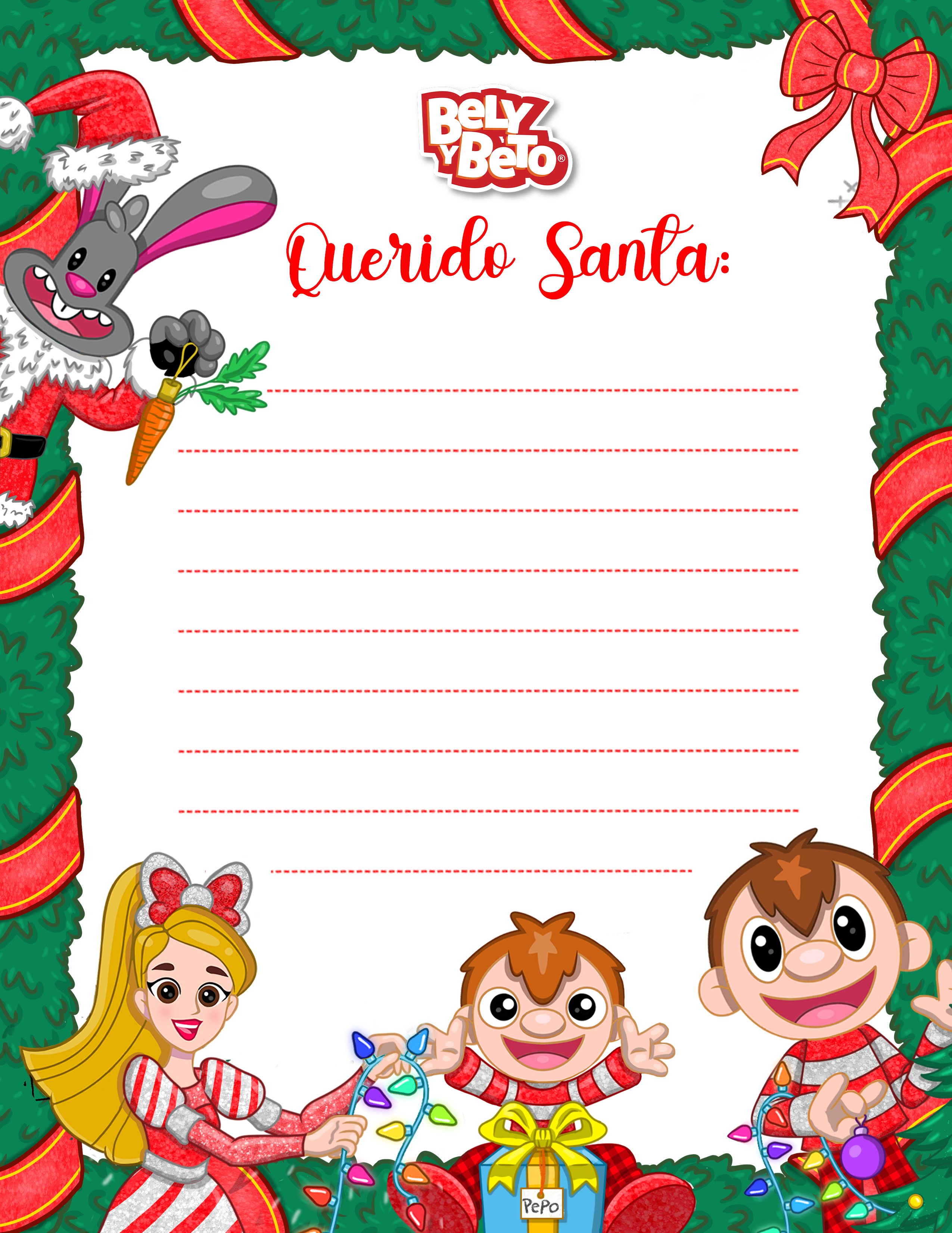 Descarga la carta de Bely y Beto para Santa Claus. 🎁 Con colores vibrantes y motivos festivos, esta carta hará que escribir los deseos sea una experiencia llena de alegría.